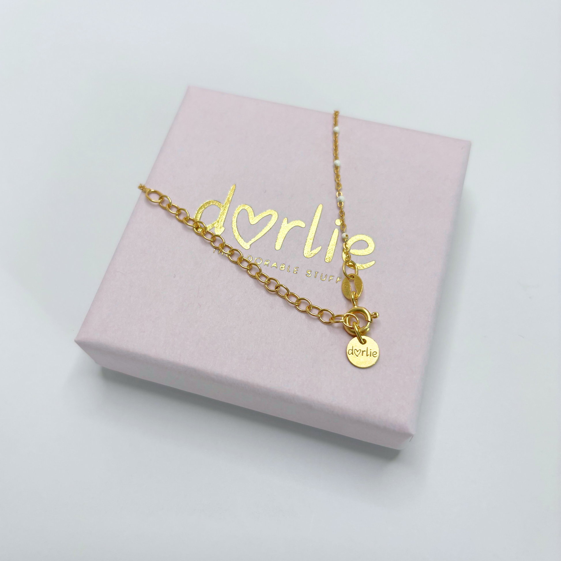 Zarte Halskette in gold, veredelt mit Emaille-Kügelchen in weiß - verspielt, elegant und einfach zum Verlieben. Diese wunderschöne Kette schmiegt sich wunderbar um den Hals und hat einen zarten Schimmer. Einzeln aber auch im Layering-Look ist diese Kette ein ganz wunderbares Accessoire ✨