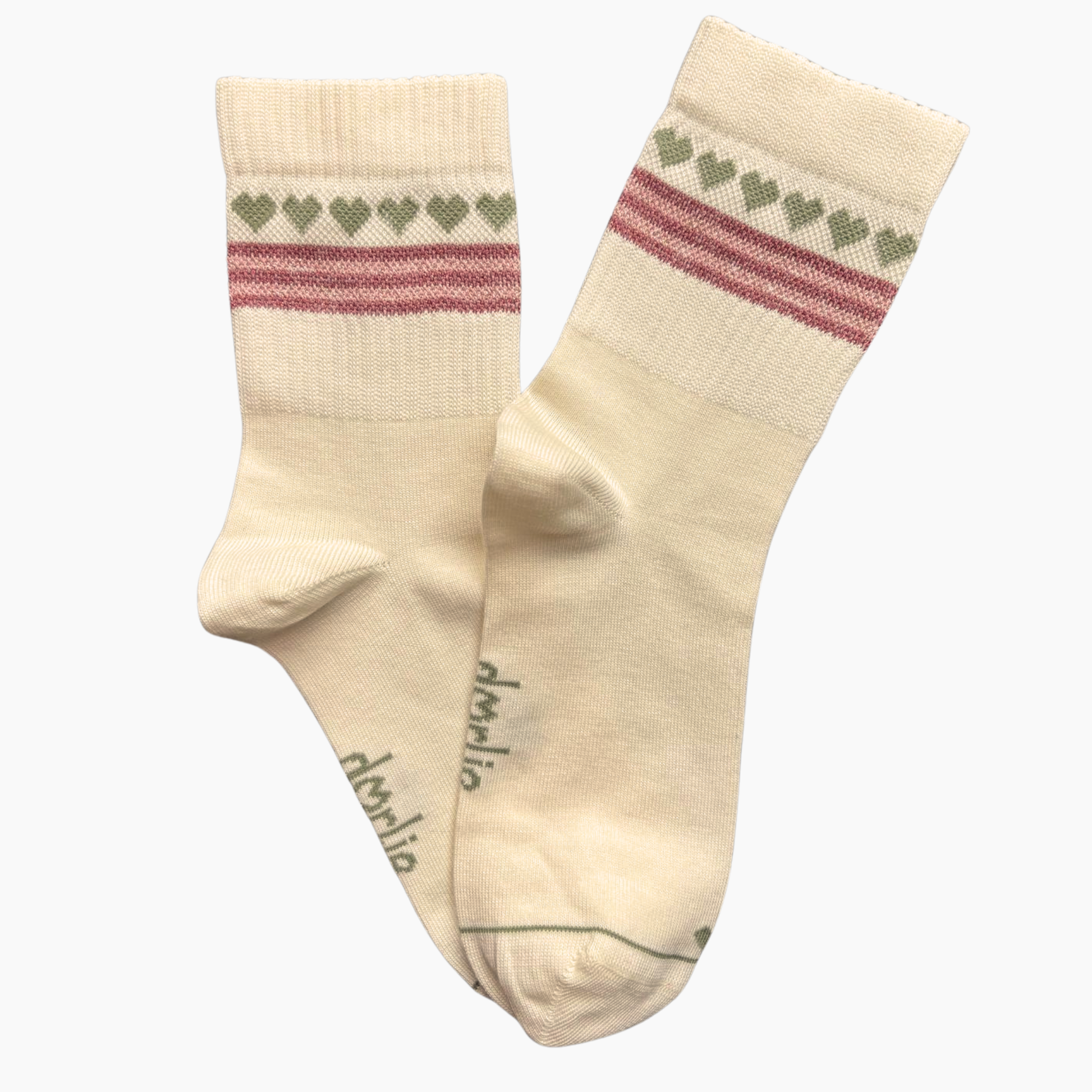 Bezaubernden Ankle Socken in off-white mit Bordüre aus Herzchen in Matcha und eine Glitzerstreifen in dunkel- und hellrosé. Mit süßem Herzchen an der Zehennaht.