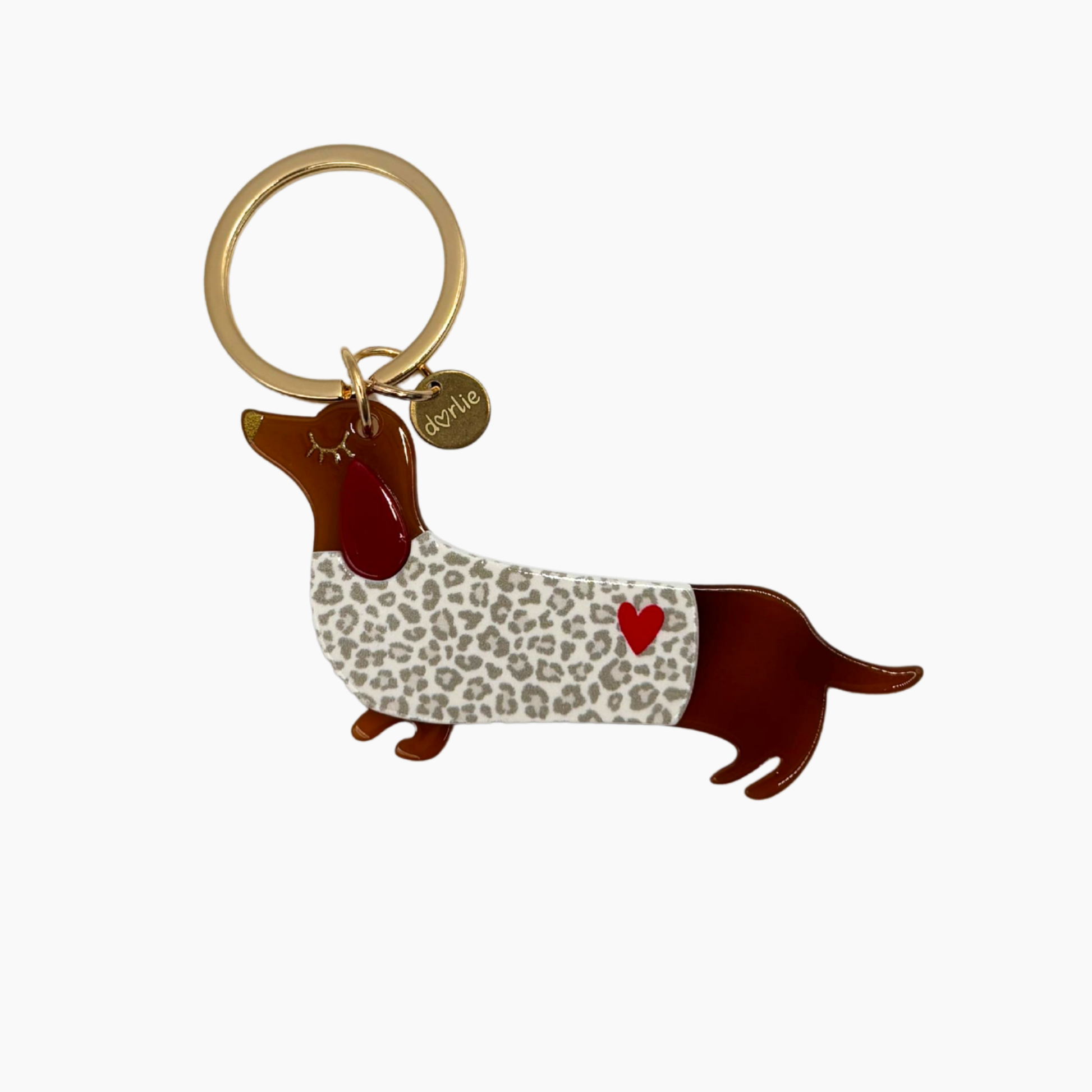 Unheimlich süßer Schlüsselanhänger. Der kleine Dackel im Leo-Mantel mit rotem Herz sieht ganz bezaubernd aus und macht jeden Schlüsselbund zu einem lieblichen Accessoire. Alle Anhänger mit niedlichem goldenen "dorlie"-Anhänger.